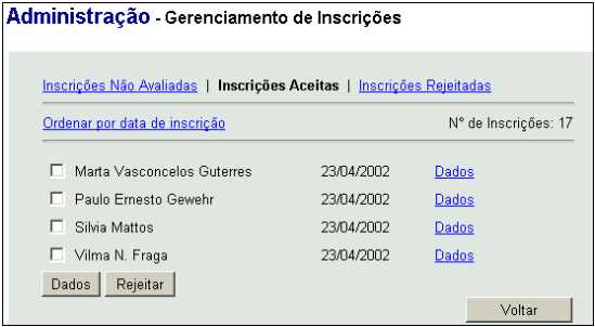 O gerenciamento de inscrições pode ser realizado tanto pelo coordenador quanto pelos formadores do curso. Os alunos inscritos podem ter suas inscrições aceitas ou rejeitadas. Esta resposta é enviada automaticamente para o endereço de correio eletrônico inicialmente informado na ficha de inscrição. Após ser avaliada e aceita uma determinada inscrição, o formador poderá analisar a lista de alunos (fig. 76) e, eventualmente, Rejeitar uma inscrição.